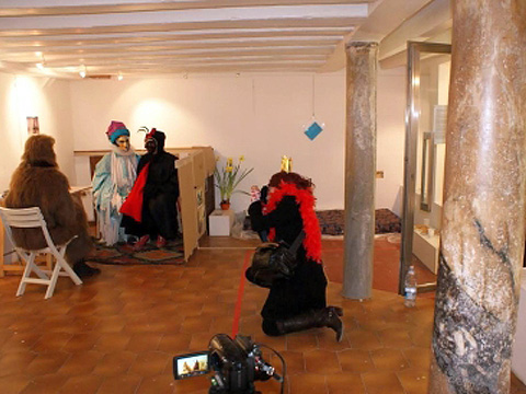 Delia Popa’s project at the Romanian Cultural Institute in Venice was a complex undertaking, which involved performances and activist actions on the streets of Venice during the Carnival, interviewing the participants at the Carnival and inviting them in the artist’s studio constructed in the space of the gallery, where sketches and other materials were put on display. The internal mechanisms of “site-specific art making” were made visible by placing a monitor in the windows of the gallery, which showed the artist’s activities in “real time”.