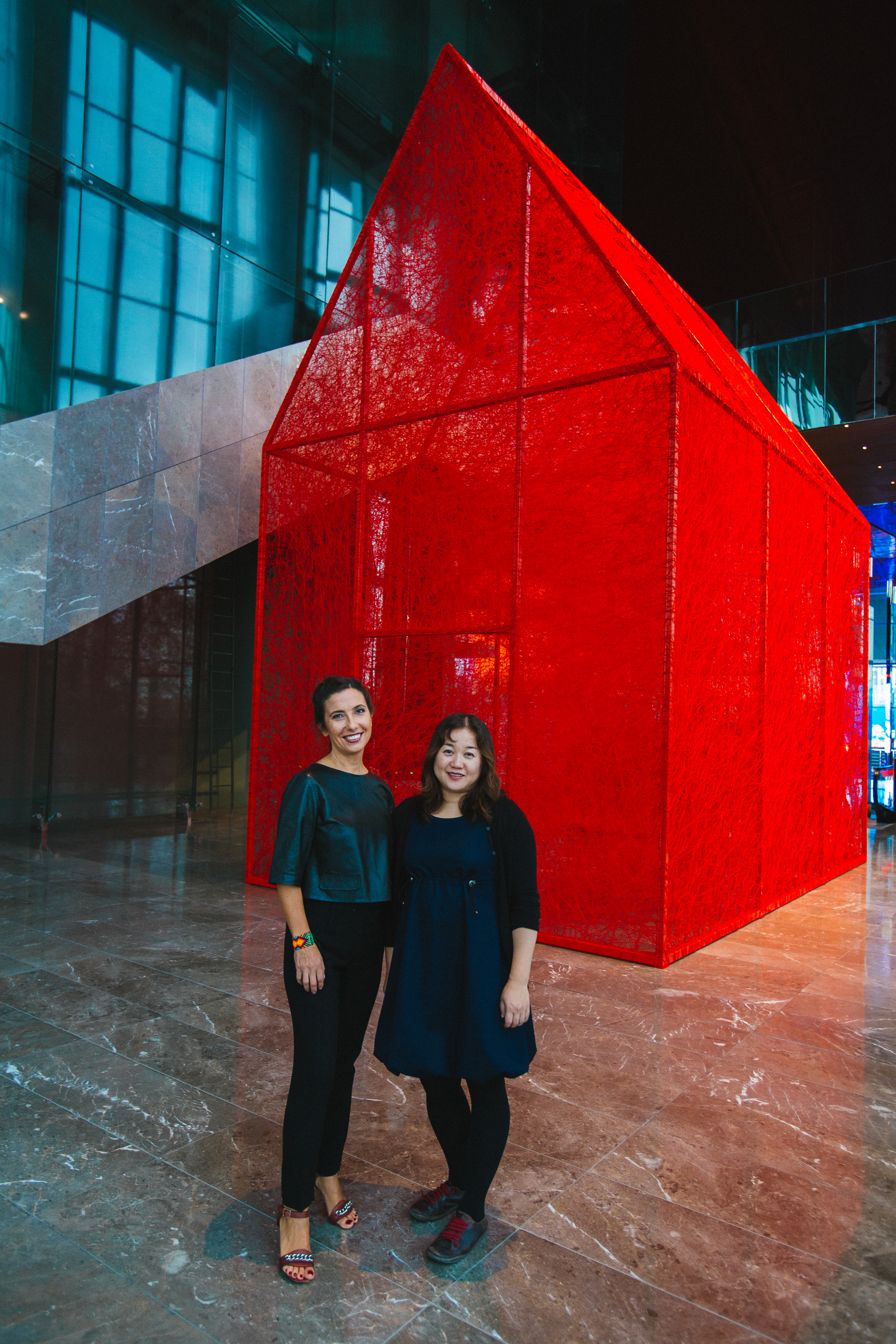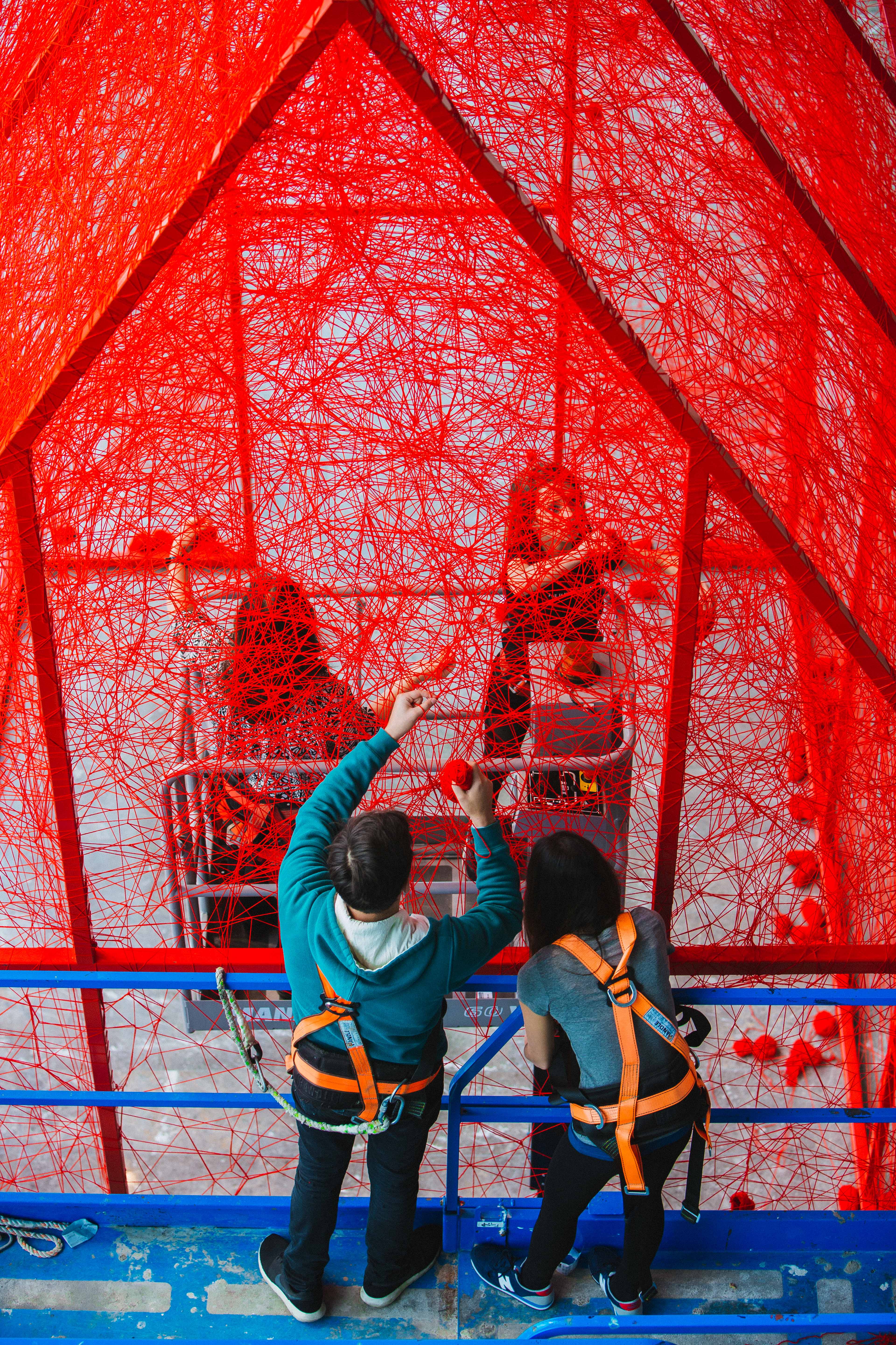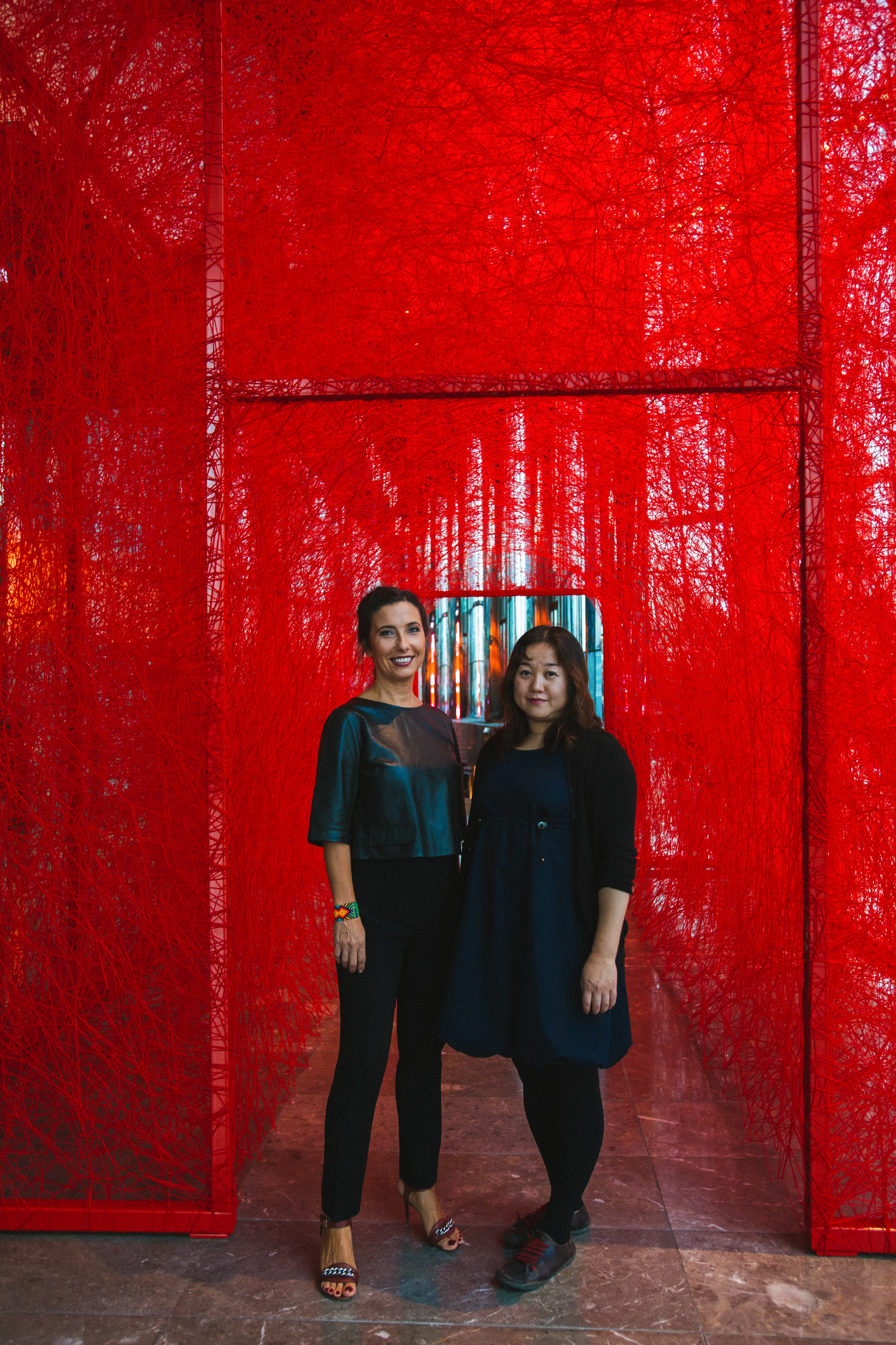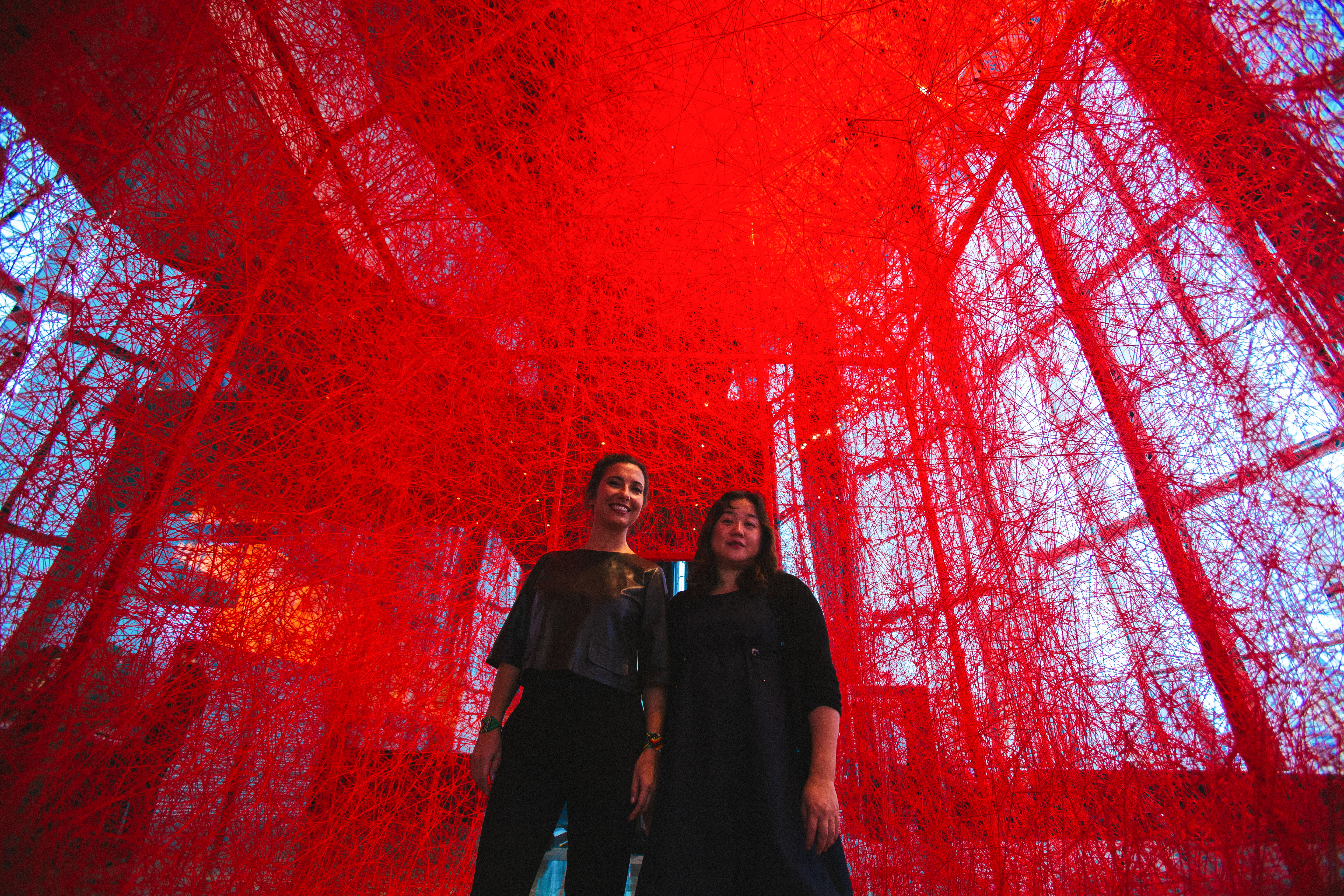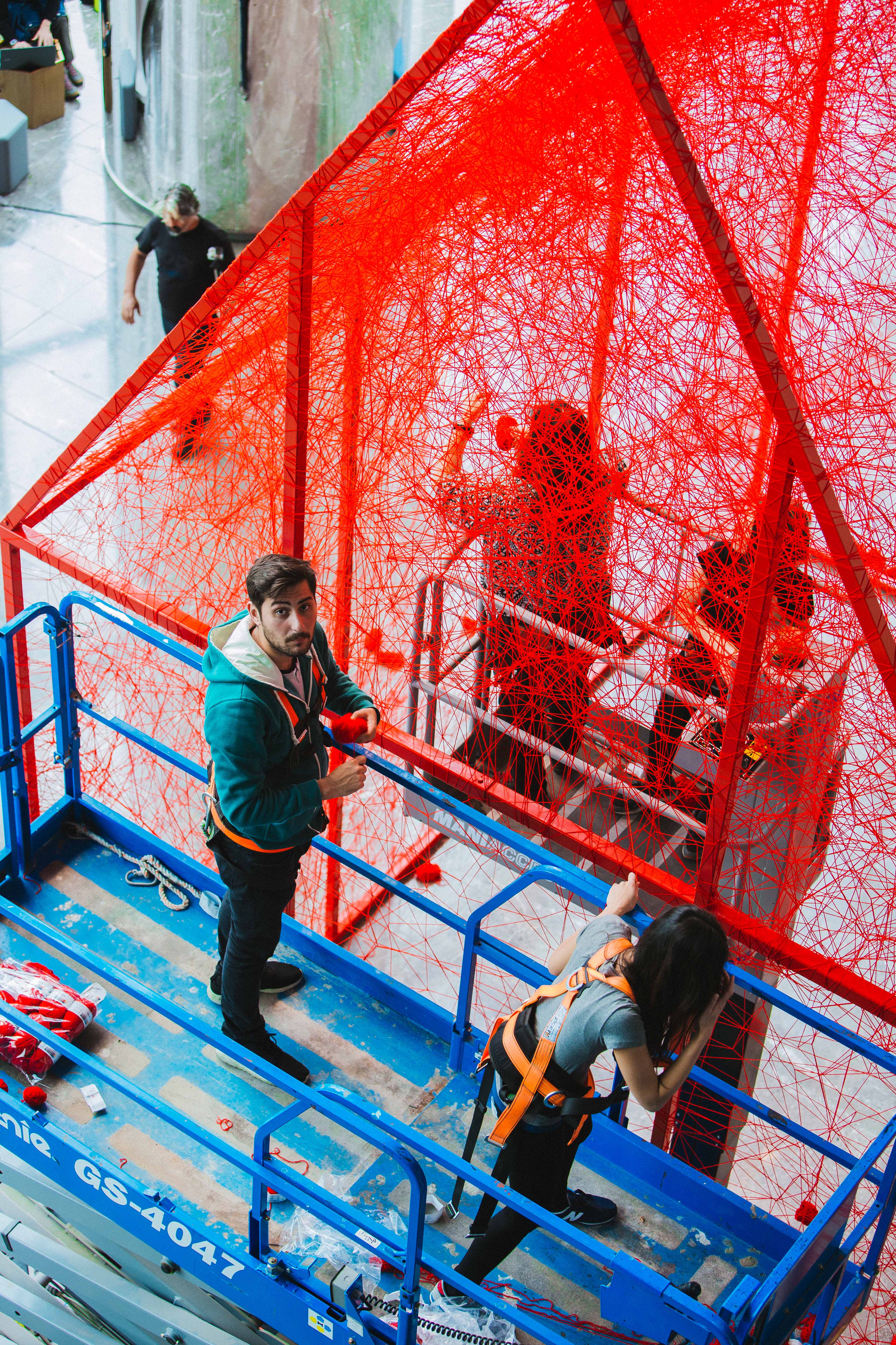 First House is composed of a metal construction of 4m X 6m X 7m dimensions which is later woven by the artist with red wool yarn of approximately 150,000 meters. By weaving the threads, Chiharu Shiota alludes to the themes of memory, human beings and the desire to search out one`s self and place in society. Through the scale of her installation, Shiota invites the viewer to become part of her artwork. First House does not represent an imaginary or utopian reality but rather a shared activity; an encounter between the viewer and the artwork. In this encounter, meaning is elaborated collectively, rather than in the space of individual consumption. With each different visitor, the exhibition acquires a different narrative, reflecting the different personal journey of each individual. The installation puts forward the idea of the individuals` existential condition of “being there” and one`s spiritual voyage to the ultimate potential take place on the same plane. Shiota describes First House as the House of Self. By placing the viewer in the centre, she refers to the self and the attendant voyage of discovery that defines a person. Who are you? What will you become? How do you realise your best self? By the red colour of First House, Shiota, evokes life as referring to the blood running in our veins. The colour red symbolises new beginnings, sunrise, life forces and enlightenment in various Eastern doctrines and also in the Shamanic medicine wheel. With its colour, the installation does not only address the self and its development but also one`s birth and the conception of life. Everything from our earliest steps to our view of the emerging world is considered here. Ultimately, the installation speaks to the person we are becoming and will become, both internally and physically. It addresses our personality and presentation to the world – our essential qualities, approach to life, demeanours and basic sensibilities.