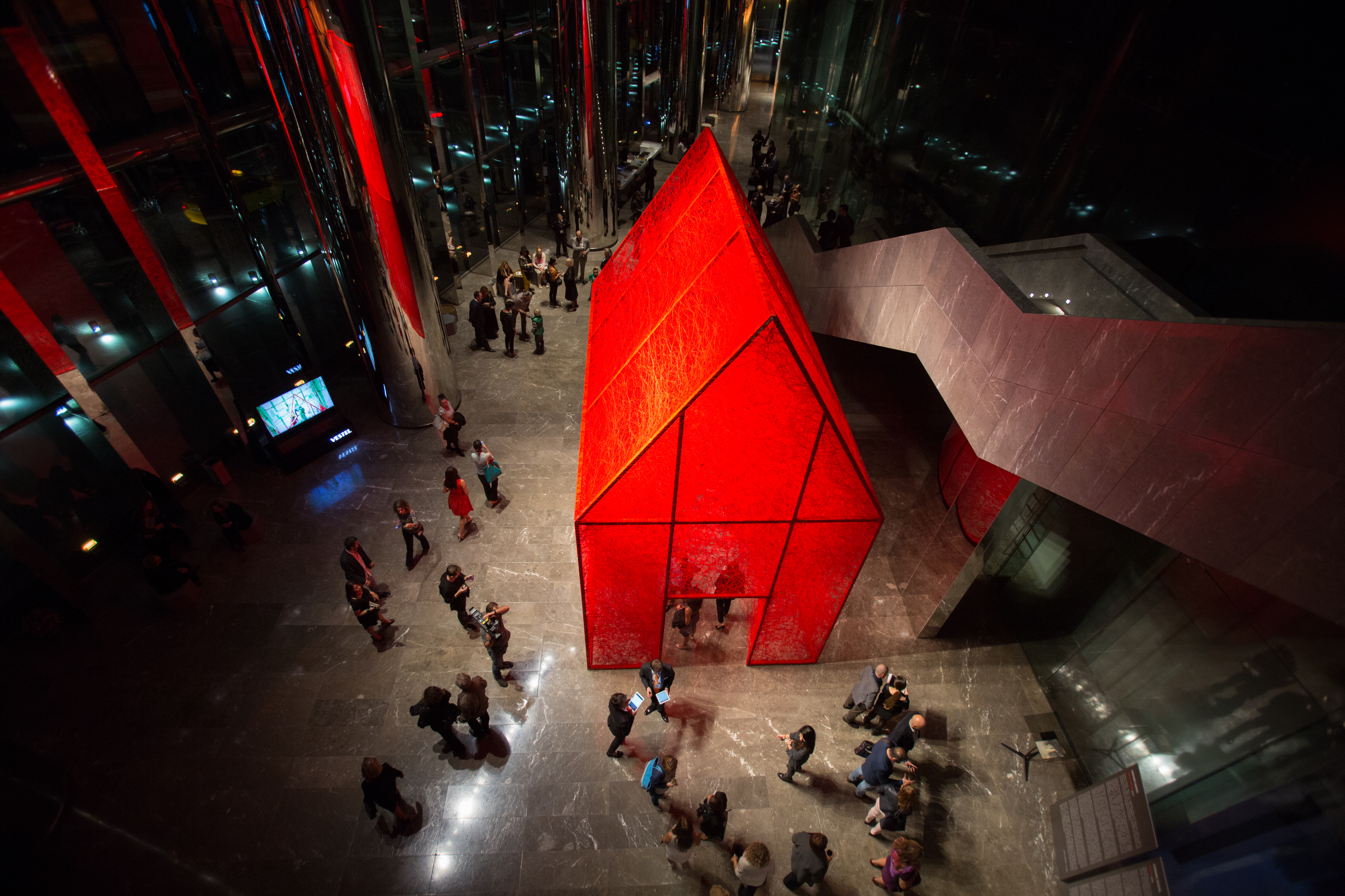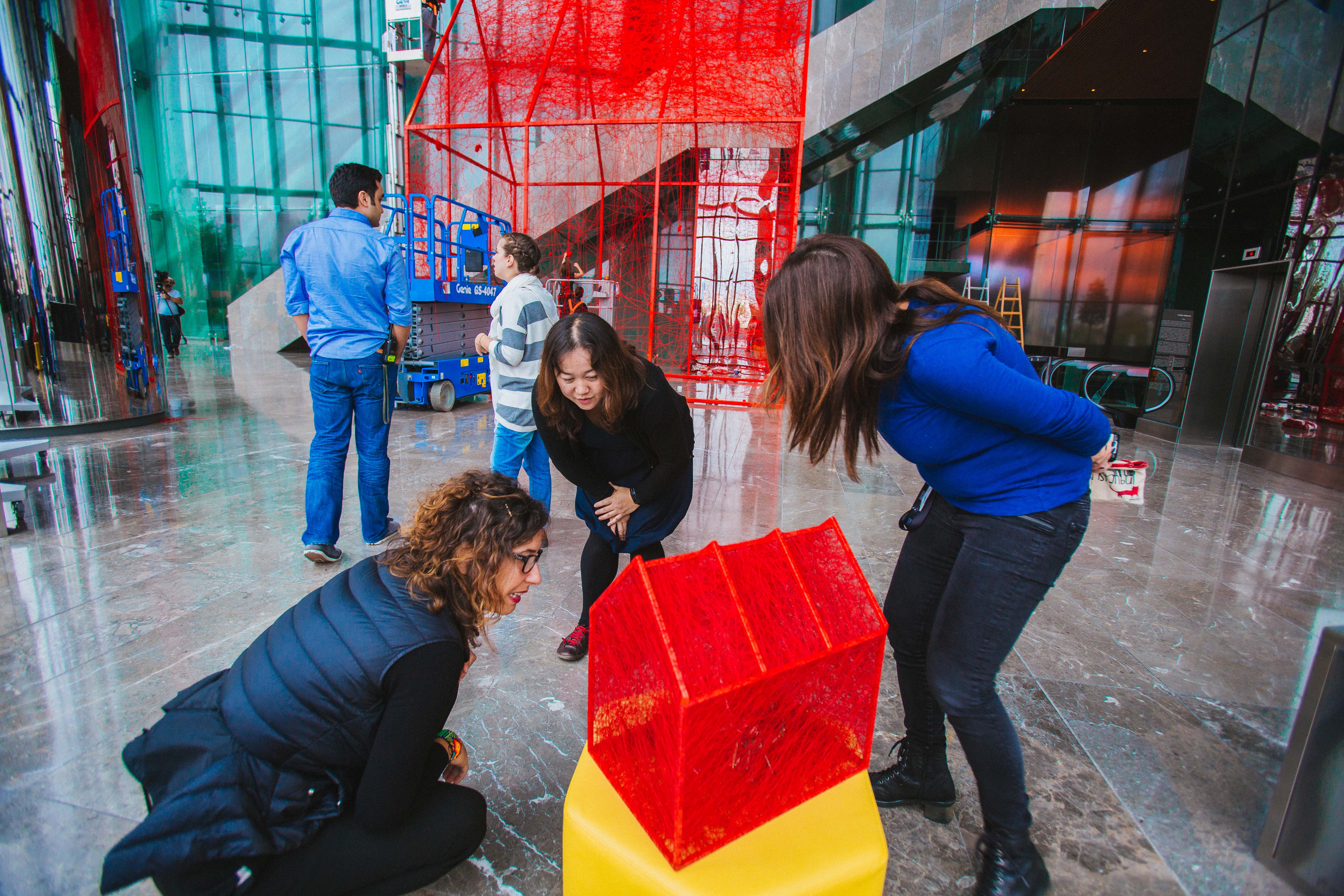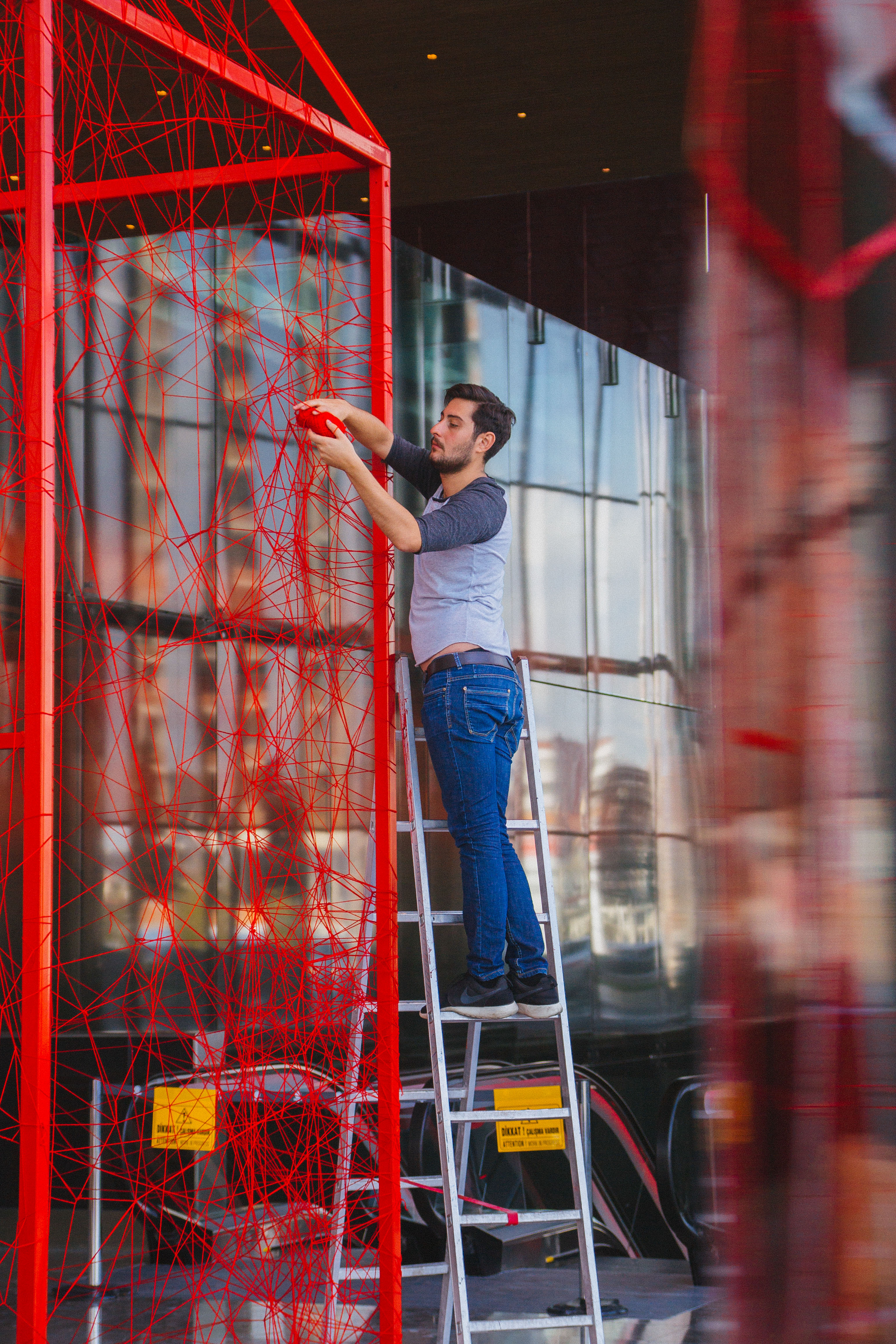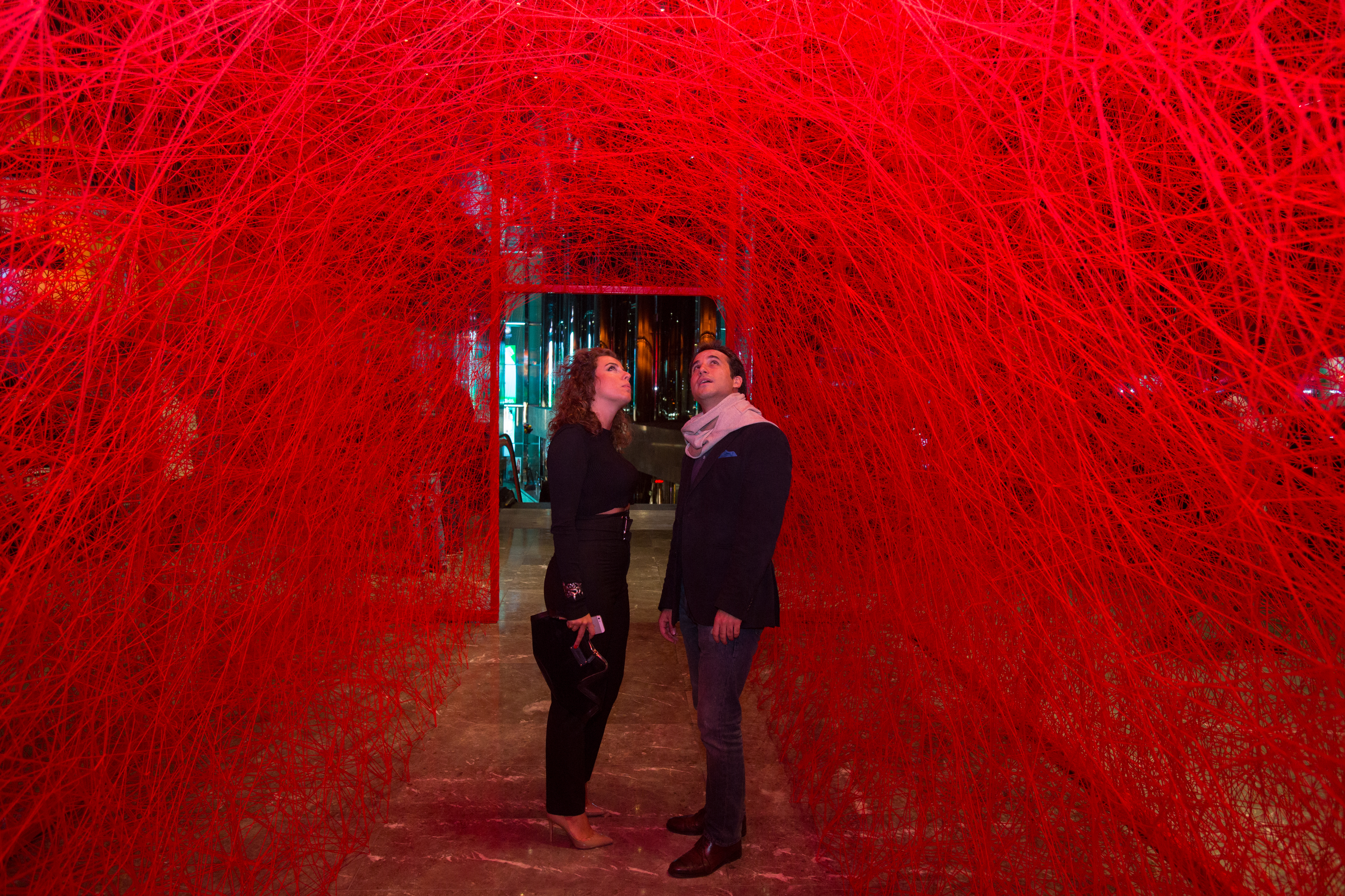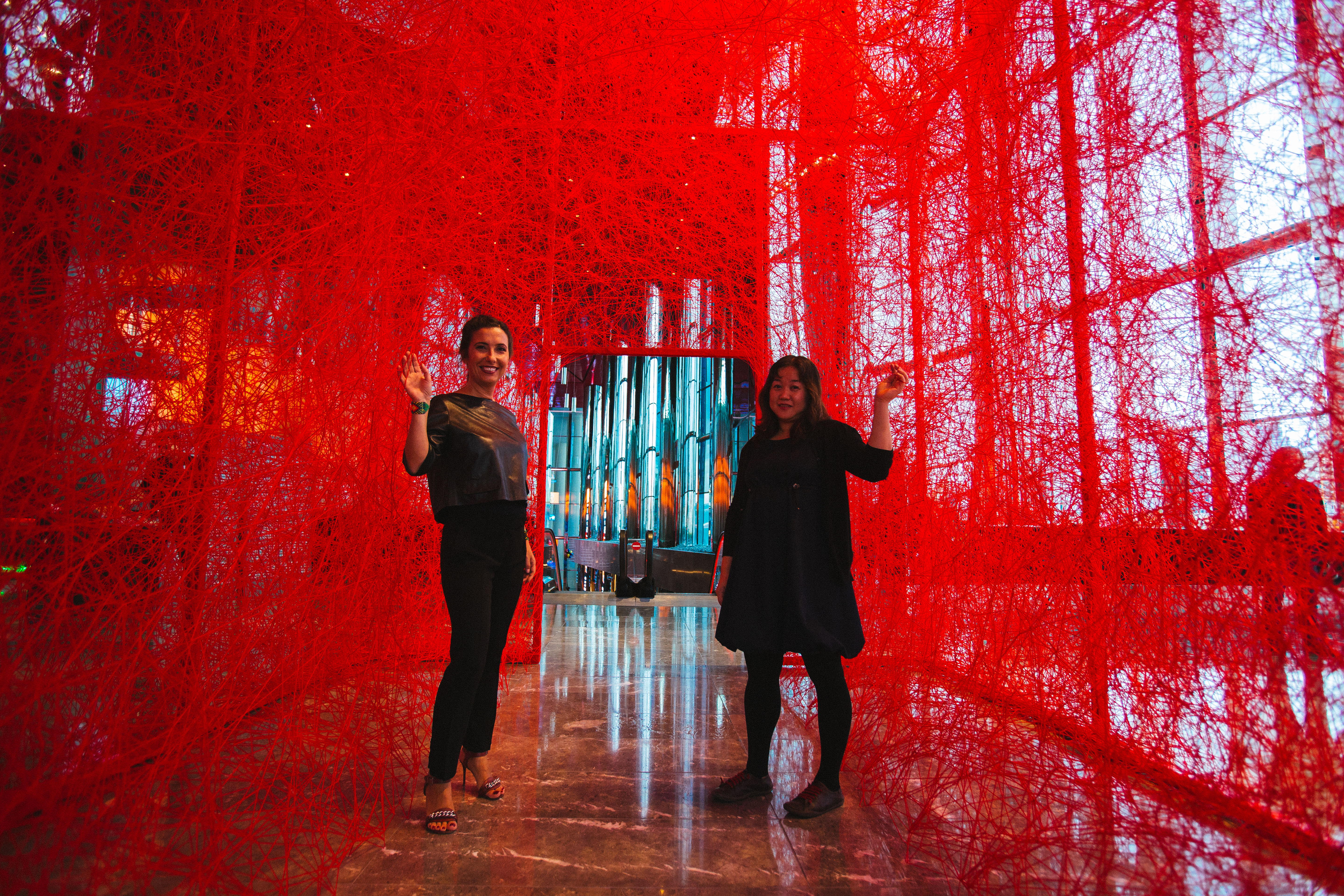 First House is composed of a metal construction of 4m X 6m X 7m dimensions which is later woven by the artist with red wool yarn of approximately 150,000 meters. By weaving the threads, Chiharu Shiota alludes to the themes of memory, human beings and the desire to search out one`s self and place in society. Through the scale of her installation, Shiota invites the viewer to become part of her artwork. First House does not represent an imaginary or utopian reality but rather a shared activity; an encounter between the viewer and the artwork. In this encounter, meaning is elaborated collectively, rather than in the space of individual consumption. With each different visitor, the exhibition acquires a different narrative, reflecting the different personal journey of each individual. The installation puts forward the idea of the individuals` existential condition of “being there” and one`s spiritual voyage to the ultimate potential take place on the same plane. Shiota describes First House as the House of Self. By placing the viewer in the centre, she refers to the self and the attendant voyage of discovery that defines a person. Who are you? What will you become? How do you realise your best self? By the red colour of First House, Shiota, evokes life as referring to the blood running in our veins. The colour red symbolises new beginnings, sunrise, life forces and enlightenment in various Eastern doctrines and also in the Shamanic medicine wheel. With its colour, the installation does not only address the self and its development but also one`s birth and the conception of life. Everything from our earliest steps to our view of the emerging world is considered here. Ultimately, the installation speaks to the person we are becoming and will become, both internally and physically. It addresses our personality and presentation to the world – our essential qualities, approach to life, demeanours and basic sensibilities.